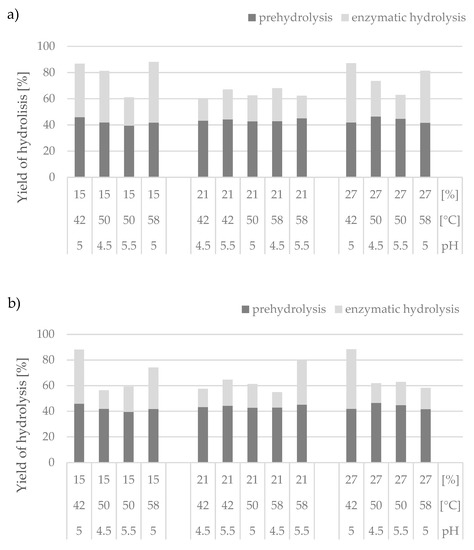 Considering the effectiveness of enzymatic hydrolysis performed with the preparation obtained under laboratory conditions, the variants with the maximum analyzed concentration of the substrate at pH 5.0 were the most advantageous. The sugars were released to hydrolysates as a result of prehydrolysis and enzymatic hydrolysis processes. The efficiency of the first step ranged from 39 to 46%. In turn, the efficiency of the enzymatic hydrolysis processes depended mainly on the process conditions, but the preparation used had no influence here because the efficiency in both processes ranged from 17% to 46% (Figure 2).