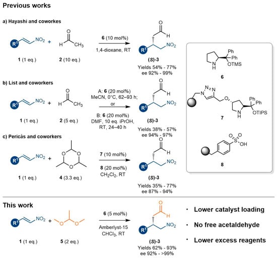 Despite the great advancement of the reports by Hayashi and List, the approach still suffers from the use of relatively high catalyst loading (10–20 mol%) and the use of a large excess of acetaldehyde; in fact, because of its high tendency to form oligomers, it was used in large excess and added slowly. Furthermore, by using two supported catalysts, Pericàs ingeniously employed paraldehyde to enable the same reaction and avoid the use of acetaldehyde [15] (Scheme 1c). Nevertheless, they used 10 equivalents of masked acetaldehyde (i.e., 3.3 eq. of paraldehyde) and a relatively high catalyst loading of supported organocatalysts that, despite the potential recyclability, bring a considerable cost contribution to the manufacture process.