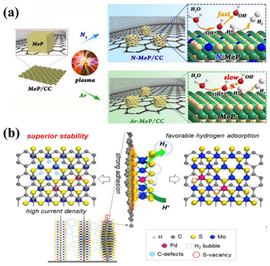 Typical non-metal heteroatomic doping of Mo-based materials includes nitrogen (N), oxygen (O), and carbon (C) atoms which can lead to changes in surface charge distribution and enhanced electrocatalytic performance [28,38,39]. In one study, Chen et al. [40] prepared MoP with N-doping under plasma treatment, which enriched Mo-P active sites and leading to electron locating near doped sites (Figure 1a). This process not only improved surface activity, but also provided new chances to understand the electrocatalytic mechanism. In another study, Tang et al. [41] reported that the N doping can modulate the electronic properties of the active sites, cause lower free energy of adsorption and desorption for the hydrogen species involved in the reaction.