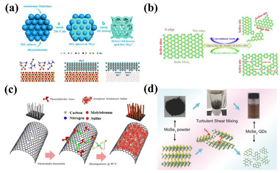 (a) schematic illustration for synthesis of inverse opal-like Mo2C with SiO2 spheres and the formation of a rich density of defects. Copyright 2017 American Chemical Society. (b) schematic illustration of the formation of active sites in MoS2. Copyright 2014 Wiley. (c) schematic illustration of three-dimensional hybrid catalyst synthesis. Copyright 2014 American Chemical Society. (d) schematic diagram of the TSM (turbulent shear mixing) process for preparing MoSe2 QDs from bulk MoSe2. Copyright 2017 Wiley.