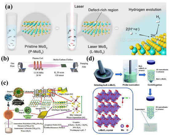 (a) synthetic procedure of L-MoS2. Color code: Cyan represents Mo, yellow represents S, white represents H, and transparent color represents vacancy. Copyright 2019 American Chemical Society. (b) schematic illustration for the experimental setup of inductively coupled plasma. Copyright 2016 Wiley. (c) schematic representation of developed synthetic strategy for bare MoS2 and MoS2-rGO nanocomposite sheets and corresponding defects. Copyright 2018 American Chemical Society. (d) a schematic diagram describing the step-by-step synthesis process from bulk a-MoO3 to 2D nanosheets. Copyright 2017 Royal Society of Chemistry.