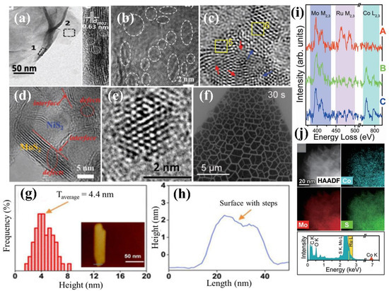 (a) TEM image for defect-rich MoS2 nanoflower. Copyright 2018 Wiley. (b) high-resolution transmission electron microscopy (HRTEM) image of ultrathin MoSe2 nanosheets. Copyright 2015 American Chemical Society. (c) HRTEM image of MoSe2 quantum dots. Copyright 2017 Wiley. (d) HRTEM images of MoS2/NiS2 nanosheets. (e) high-angle annular dark field scanning transmission electron microscope (HAADF-STEM) image of molybdenum sulfide quantum dots. Copyright 2017 Springer. (f) SEM image of monolayer MoS2 treated by plasma. Copyright 2016 American Chemical Society. AFM figure of 2D a-MoO3-x nanosheets, (g) frequency histogram of the observed thickness of the 2D nanosheets, atomic force microscope (AFM image of the nanosheet (inset), and (h) corresponding thickness profile. Copyright 2017 Royal Society of Chemistry. (i) background-subtracted Atomic-resolution electron energy loss spectrum (EELS) around the Mo2,3-, Ru M2,3-, and Co L2,3-ionization edges. (j) HAADF-STEM images, energy-dispersive X-ray spectroscopy (EDX) elemental mapping of Co (K shell), Mo (L shell), and S (K shell), and their corresponding EDX spectra ([Co] = 10% and average [Ru] = 20%). Copyright 2020 Wiley.