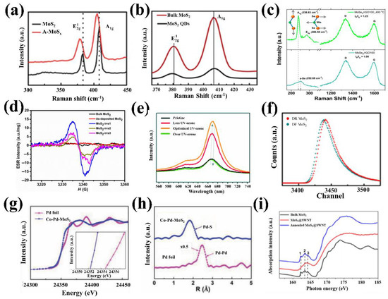 (a) raman spectra of A-MoSx and MoS2. Copyright 2016 Royal Society of Chemistry. (b) raman spectrum of bulk MoS2 and MoS2 QDs. Copyright 2019 Elsevier. (c) raman spectra of MoSe2/rGO100 and MoSe2/rGO100_400 °C with illustration of atomic vibration of A1g (left) and E2g 1 (right) as inserted. Copyright 2018 American Chemical Society. (d) ESR spectra of MoS2. Copyright 2019 Springer. (e) PL spectra of the bilayer MoS2 with increasing UV–ozone treatment. Copyright 2019 Royal Society of Chemistry. (f) positron annihilation lifetime spectroscopy of two samples and fitting results. Copyright 2018 Wiley. (g) the normalized Pd K-edge X-ray absorption near edge structure (XANES) spectra. Inset: The enlarged Pd K-edge XANES spectra. (h) Fourier transforms of k3-weighted Pd K-edge of the extended X-ray absorption fine structure (EXAFS) spectra of Co-Pd-MoS2 and Pd foil, demonstrating Pd has replaced Mo atoms successfully instead of forming particles or clusters. Copyright 2020 Wiley. (i) S L-edge XANES spectra of bulk MoS2, MoS2@SWNT hybrid, and the annealed hybrid, indicating transitions of S2p electrons to unoccupied s- or d-like states. Copyright 2016 Springer.