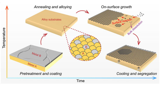 In addition, transferring graphene from metal substrate to a functional substrate is required for most of applications. In such process, chemical etching, electrochemical bubbling and direct mechanical delamination methods are usually employed to remove the growth substrates [79,80,81,82]. Therefore, the alloy substrates should be designed with the feature that can be easily etched or decoupled from the graphene films, which calls for more investigations in the future research.