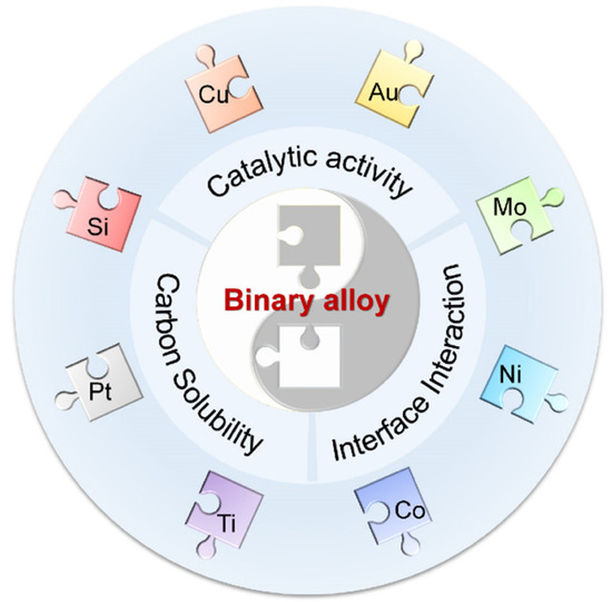 Generally speaking, there are two sources of the metals that make up alloy catalysts. One source includes the commonly used transition metals, including those with low carbon solubilities and/or weak metal–graphene interactions, such as Cu [17], Au [37], and Pt [38], in addition to those with high carbon solubilities and strong metal–graphene interactions, such as Ni [18] and Co [39], and those forming strong bonds with carbon, such as Ti [40,41] and Mo [42]. Another source is some nonmetallic elements that can form alloys with metals, such as Si. As mentioned above, the catalytic activity, carbon solubility, and interface interaction should be comprehensively considered to determine the elements present in an alloy (Figure 2). In addition, the miscibility of the elements is also an important prerequisite for the formation of alloys. Some physical properties of representative metals and Si crystals are listed in Table 1 for reference.