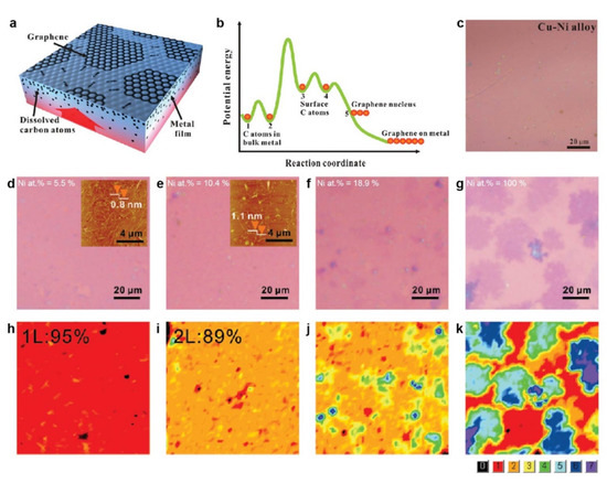 To control the layer number, one promising strategy is the use of the segregation technique proposed by Liu’s group, where the as-formed graphene film originates from the carbon atoms dissolved in the bulk of the catalysts [35]. Therefore, binary alloys with adjustable carbon solubilities would be preferred, as in the case of the Cu/Ni alloy. More specifically, through the deposition of metal films (e.g., Ni and Cu) on SiO2/Si substrates to form a sandwiched Cu/Ni/SiO2/Si structure and subsequent high-temperature annealing, a Cu/Ni alloy can be formed, accompanied by the segregation of graphene films from the dissolved carbon atoms (Figure 3a). The plausible kinetic processes are summarized as follows. The dissolved carbon atoms undergo dynamic diffusion in the bulk, with some of them escaping onto the surface of the metal to initiate surface-mediated diffusion. Subsequently, the graphene domains nucleate at the defect or stepped sites of the catalysts and expand their size during the growth stage (Figure 3b). Indeed, this was the first time that the Cu/Ni alloy was used as the catalyst to prepare uniform graphene films (Figure 3c). The possibility of controlling the layer number of graphene films by the segregation technique was also explored, since this benefits from the fact that the atomic percentage of Ni can be precisely defined by controlling the thickness of the Ni films during the deposition process [26]. As shown in Figure 3d–k, a uniform monolayer graphene film with 95% coverage and BLG with 89% coverage were achieved by increasing the Ni content from 5.5 and 10.4%, respectively. A further increase in the Ni content gave rise to thicker graphene films. For the case of a low Ni content, the segregation behavior is approximately determined by Cu, where the weak metal–graphene interactions and low carbon solubility weaken the influence from the substrate, and result in the formation of single-layer graphene. The increase in the Ni content leads to the dissolution of a greater number of carbon atoms in the alloys to ultimately yield increased layer numbers of graphene.