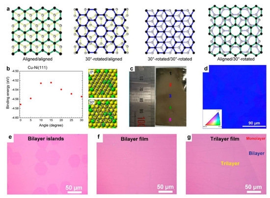 Growth of AB-stacking bilayer graphene (BLG) on Cu/Ni alloy catalysts. (a) Schematic illustration of the typical stacking orientations of BLG with respect to that of the substrate. (b) The binding energy of graphene on Cu/Ni(111) as a function of the relative orientation. (a,b) Reprinted with permission from [56]. Copyright (2016), American Chemical Society. (c) Photographic image of the Cu/Ni(111) foil. (d) EBSD IPF image of the Cu/Ni(111) foil. (e–g) Optical images of (e) the BLG islands, (f) a continuous BLG film, and (g) a TLG film. (c–g) Reprinted with permission from [60]. Copyright (2020), Springer Nature.