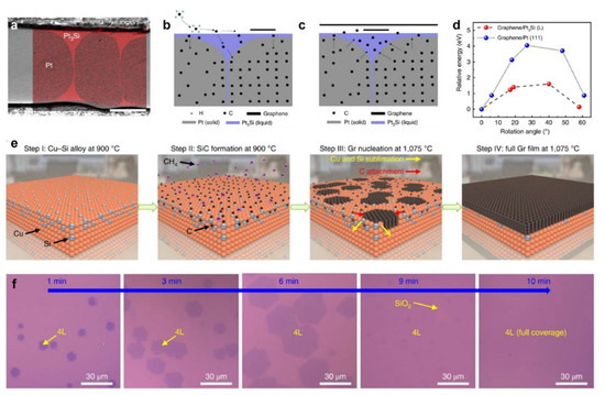 Although extensive efforts have been made, several challenges still exist. For example, because the interlayer coupling between two layers of graphene is not sufficiently strong to prevent the influence of substrates with a non-uniform surface state, obtaining a continuous perfect AB-stacking BLG film remains a challenge. To address this issue, novel Pt3Si/Pt substrates were utilized as catalysts [61]. As shown in Figure 5a, a core–shell structure is clearly distinguished after the deposition of a Si film on polycrystalline Pt foils followed by high-temperature annealing. Given that the Pt core features a high melting point (1768.4 °C), while the Pt3Si shell melts at a relatively low temperature (830 °C), it tends to form a surface melting state, i.e., liquid Pt3Si, at the growth temperature of graphene (1100–1025 °C), which is crucial for the interlayer epitaxial growth of uniform AB-stacking BLG. Following the on-surface growth of the first layer of graphene at 1100 °C (Figure 5b), the liquid Pt3Si provides a channel for carbon atoms precipitating from the Pt core to the surface. As a consequence, uniform BLG films were formed (Figure 5c). In addition, the smooth and uniform surface of the liquid Pt3Si renders the graphene domains easier to rotate on the liquid surface, allowing them to adopt the energy-favorable AB-stacking configuration (Figure 5d). These together contribute to the formation of a large AB-stacking BLG film. Very recently, significant progress has been made in synthesizing extremely uniform (100%) AB-stacking BLG and ABA-stacking TLG on a Cu/Si alloy [28]. Overall, four steps are involved in the preparation of graphene films: (1) The Cu/Si alloy is formed by annealing the Cu(111) film inside the quartz chamber at 900 °C, where the Si atoms come from the quartz tube; (2) the SiC layer is formed on the surface of the catalyst by introducing a carbon source (CH4) into the chamber; (3) as the temperature increases to 1075 °C, graphene domains nucleate owing to the sublimation of Si atoms from the SiC layer; (4) the graphene domains expand with elongation of the annealing time, and finally merge into full graphene films (Figure 5e). Contrary to the segregation phenomenon on the Cu/Ni alloy, once the layer number of the initial graphene nuclei on the Cu/Si alloy is determined, each layer grows simultaneously at the same rate throughout the growth process, which is attributed to the diffusion-to-sublimation growth mode (Figure 5f). It was found that the layer numbers of graphene films can be precisely controlled by tuning the CH4 concentrations during the process of SiC formation. Moreover, an optimal Si content (28.7%) exists in Cu/Si alloy catalysts to ensure the uniformity of the graphene layer, in which a small Si content will lead to a non-uniform thickness of the graphene films, while a larger Si content results in insufficient graphene growth due to the limited catalytic activity for decomposing the carbon source.