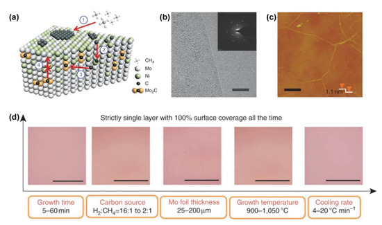 Growth of strict monolayer graphene on a Ni/Mo alloy. (a) Schematic illustration of the growth mechanism of graphene on a Ni/Mo alloy. (b) TEM and (c) AFM images of the monolayer graphene grown on a Ni/Mo alloy. Inset in (b) is the corresponding selected area electron diffraction pattern. (d) Optical images of the strict monolayer graphene synthesized using different growth parameters. Reprinted with permission from [27]. Copyright (2011), Springer Nature.