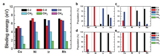 Theoretical calculation of the catalytic decomposition of CH4 on typical metal substrates. (a) The binding energies of the various CHi (i = 0, 1, 2, 3, 4) species with Cu, Ni, Ir, and Rh. Note that when i = 0, the carbon specie can exist whether on metal surface (C-I) or subsurface (C-II). (b–e) Population of the various CHi species on the Cu(111), Ni(111), Ir(111), and Rh(111) surfaces at temperatures of (b) 800 K, (c) 1000 K, (d) 1200 K, and (e) 1400 K. Reprinted with permission from [69]. Copyright (2015), Royal Society of Chemistry.