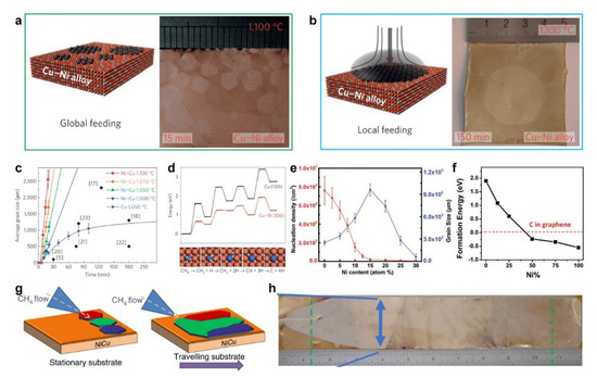 As the commercial metal foils and films are almost polycrystalline in nature, the orientation distribution among different graphene domains on these substrates is wide, resulting in dense grain boundaries during the coalescence process [71,72]. To address this issue, one promising route is to reduce the nucleation density of graphene domains while accelerating the growth rate. In 2016, an isolated monolayer graphene with a large domain size (1.5-inch) was achieved in a short growth time (2.5 h) [73]. Such a low nucleation density is attributed to the following aspects: (1) A Cu85/Ni15 foil was adopted as the growth substrate instead of conventional Cu foil; (2) contrary to the common global carbon source feeding strategy (Figure 8a), local feeding of the carbon source was employed for nucleation control (Figure 8b). Moreover, the domain size of graphene increased linearly with time on Cu/Ni, in contrast to that of saturation behavior on Cu (Figure 8c), owing to its higher catalytic activity for decomposition of carbon species (Figure 8d). Further in-depth exploration revealed that the nucleation density of graphene decreased with an increase in Ni content in the Cu/Ni alloy (Figure 8e), which is consistent with the decreased formation energy of adsorbed carbon atoms (Figure 8f) [74]. Note that a turnover of the formation energy from positive to negative appears at a Ni content of ~40%, which indicates that the carbon atoms prefer to remain independent and diffuse into the bulk rather than assembling into graphene on the surface at high Ni concentrations. Thus, there is a tradeoff between improving the catalytic activity and maintaining the on-surface growth of monolayer graphene.