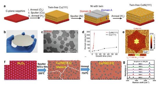 Low-temperature and fast growth of the single-crystal graphene films on single-crystal Cu/Ni(111) substrates. (a) Schematic illustration of fabrication of the single-crystal Cu/Ni(111) wafers via a two-step sputtering/annealing method. (b) Photographic image of the as-prepared single-crystal Cu/Ni(111) wafer. (c) SEM image of the epitaxial growth of the graphene domains on Cu/Ni(111). (d) Comparison of the domain size as a function of growth time on Cu/Ni(111) and Cu(111). (e) Raman 2D peak position mapping of a graphene domain on Cu/Ni(111). (a–e) Reprinted with permission from [24]. Copyright (2019), Elsevier. (f) Schematic illustration of fabrication of the single-crystal Cu/Ni(111) wafer via one-step sputtering. (g) Raman spectra of graphene films grown at different temperatures. (f,g) Reprinted with permission from [25]. Copyright (2019), Wiley-VCH.