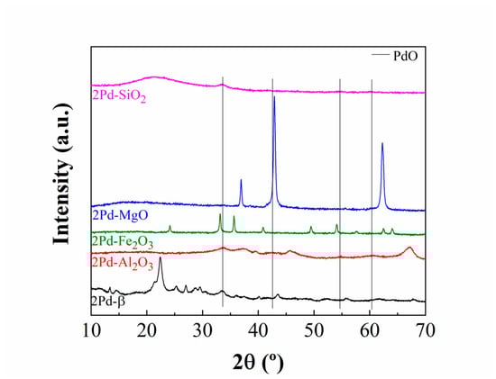 X-ray diffraction patterns of Pd supported on β-zeolite, Al2O3, Fe2O3, MgO, and SiO2 (Pd content: 2 wt.%; vertical lines indicate the position of PdO signals).