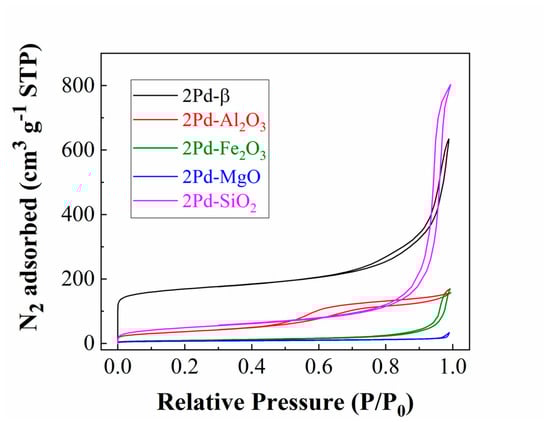 The textural properties were determined from N2 adsorption–desorption isotherms at −196 °C. The shape of isotherms (Figure 3) is very different, depending on the type of support. Thus, according to the International Union of Pure and Applied Chemistry (IUPAC) classification, the isotherm of 2Pd-SiO2 can be considered as Type II [34], associated to macroporous materials with an important N2 adsorption at high relative pressure due to interparticle voids between adjacent SiO2 particles. The catalysts 2Pd-MgO and 2Pd-Fe2O3 also exhibit Type II isotherms. The low N2 adsorption at low relative pressures indicates the absence of micropores. These data seem to be in agreement with the presence of bigger crystals of MgO and Fe2O3 in comparison to other supports (Figure 1 and Figure 2). The adsorption in the 2Pd-Fe2O3 at high relative pressure suggests the presence of some macroporosity. 2Pd-β is mainly microporous, as inferred from the raise of adsorption at low relative pressure. In the case of 2Pd-Al2O3, the profile can be fitted as Type IV (a) [34], which is typical of mesoporous materials, where the presence of hysteresis loops suggests the presence of pores wider than 4 nm.