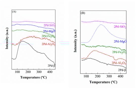 Once textural properties were determined, the quantification of the total amount of acid and basic sites was accomplished. The estimation of acid sites from NH3-TPD analysis (Figure 5A and Table 2) reveals that the catalyst with the best textural properties, 2Pd-β, also displays the highest amount of acid sites (455 μmol g−1), as expected, whereas the 2Pd-SiO2 catalyst exhibited the lowest acidity values (25 μmol g−1), even lower than that shown by a basic support like MgO. In this latter case, its acidity can be associated to structural defects in the metal oxide network.