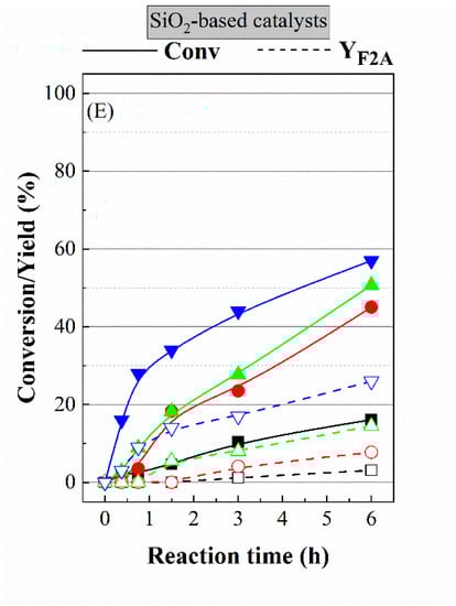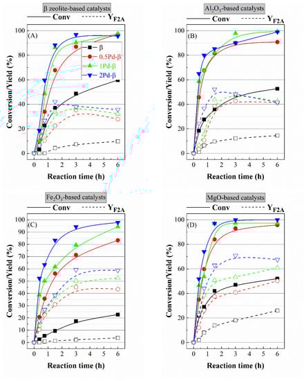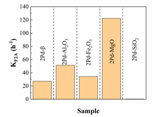 From the analysis of the slope of F2A productivity, it is possible to establish a kinetic constant of F2A formation, denoted as kF2A (Figure 9). These data reveal the highest kF2A (122 h−1) for 2Pd-MgO, while, in the opposite case, 2Pd-SiO2 displays kF2A close to zero.