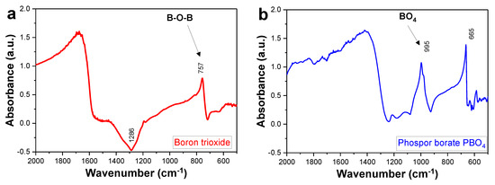 Similarly, phosphor borate (PBO4) can also form a glass by itself. The blue plot in Figure 1b shows the FTIR spectrum collected on glassy PBO4 that was formed after being treated at 400 °C for dehydration. The sharp peak at 995 cm−1 is assigned to the BO4 structure, while the 665 cm−1 peak is due to PO4 vibrations [14,15]. The peak sharpness is related to the short-range ordering in the glass network as compared to broader absorbance in amorphous structures. The total absorbance cutoff is at ~1400 cm−1 for glassy PBO4.