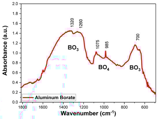For alumina and boron trioxide mixtures, glassy structures, or polymeric network structures of boron trioxide cannot be formed even after high temperature treatments. Depending on the preparation temperature and the stoichiometric ratio between aluminum and boron, aluminum borate may form different cluster structures [20,21]. Figure 2 shows the FTIR spectrum collected for Al18B4O33 purchased from Alfa Aesar, which shows dominating BO3 structures centered at 1320, 1260, and 700 cm−1, and less amount of BO4 structures at 1075 and 985 cm−1.