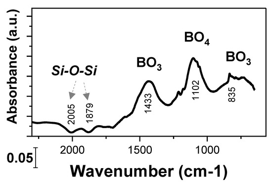 FTIR characterization of boron-containing materials is widely used in the field of glasses and ceramics. The borate vibration modes are detected in three main infrared regions. The IR absorbance in the 1200–1500 cm−1 range is assigned to asymmetric stretching of B-O bond in trigonal BO3 units. The B-O stretching in tetrahedral BO4 units is in the range of 800–1200 cm−1. The bending vibrations of bridging oxygen (B-O-B) between BO3 and BO4 units are active in the range of 600–800 cm−1 [17,18,19].