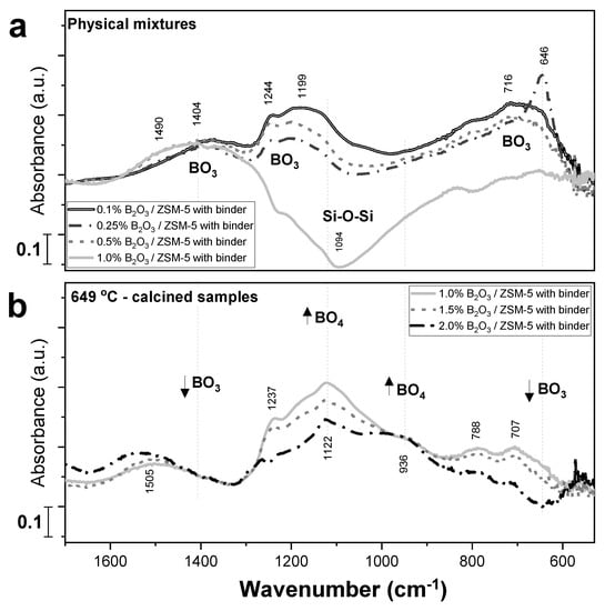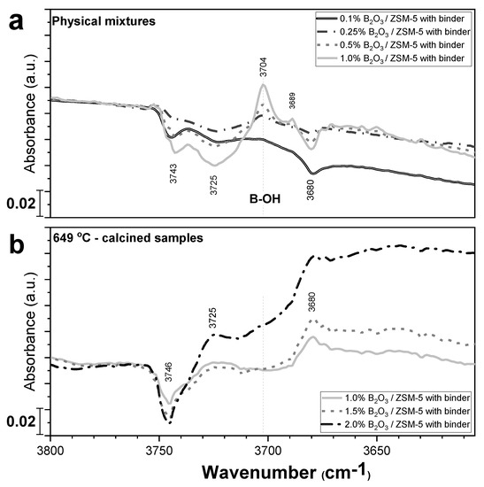 In order to illustrate the interaction and transformation of boron trioxide with other materials used in FCC, two sets of experimental samples containing boron were prepared specifically for the FTIR characterization study. In order to achieve a cleaner comparison for this part of the study, an additive setup was chosen as the model system. ZSM-5 additives are typically used in FCC operations to boost propylene selectivity as well as to increase gasoline octane value [22,23]. They crack the gasoline range olefins into smaller hydrocarbons, and to serve that specific purpose they are typically simpler in design compared to base FCC catalysts since cracking matrices and metals traps that are part of the base resid-FCC catalysts are not included in the additive construct. To be able to provide information on the transformation of boron trioxide in an FCC microsphere production and use, samples prepared with an identical additive recipe were calcined at typical FCC catalyst/additive manufacturing conditions as a final step of the procedure. These comparisons were repeated at various boron loadings.