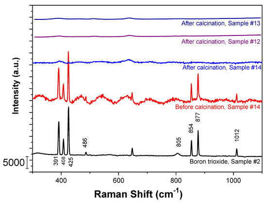 Raman Spectra in Figure 6 shows the comparison of calcined FCC additive Samples #12 and #13 (collected using a 488-nm laser) and a silicoaluminate support loaded with B2O3 before and after calcination using a 785-nm excitation laser, where the spectra collected under different lasers were normalized using peak intensity at 635 cm−1. In this experiment, a reference sample of standard pure boron trioxide was also included and showed Raman shifts at 258, 271, 391, 408, 425, 486, 648, 854, 877, 1012, and 1274 cm−1, where peaks at 258, 271, 391, 408, 425, 648, 854, 877 cm−1 are assigned to BO3 and peaks at 486, 1012, 1274 cm−1 are assigned to BO4 [24,25,26,27,28]. The silicoaluminate support loaded with B2O3 (before calcination) shows these B2O3 Raman peaks, while the calcined samples do not have any of these peaks. This result demonstrates that after calcination, the precursor B2O3 phase disappears, which is likely due to the formation of borate species.
