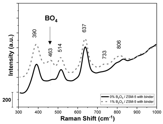 Raman spectra in Figure 7 show a close look of the top two traces of spectra in Figure 6, which demonstrate the presence of BO4 borate unit in the ZSM-5 sample with boron. Compared to the reference sample #12 without any boron oxide precursor, the sample #13 with 1 wt.% B2O3 as precursor shows an additional signal at 463 cm−1, which is assigned to BO4 unit vibration based on the peak assignments using a commercial standard phosphor borate material. Other peaks at 390, 514, 637, 806 cm−1 exist both in the control sample (no boron) and the 1% boron addition sample, which are possibly due to some TiO2 present in the samples.