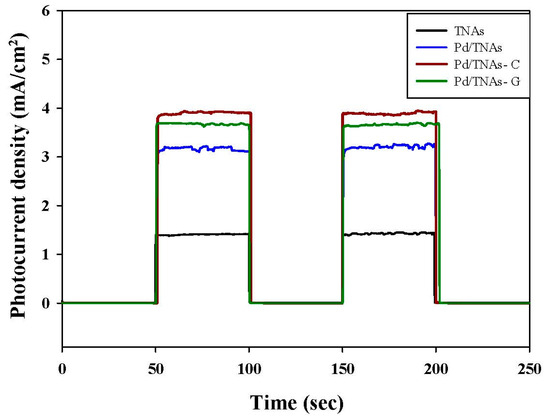 2.4. Hydrogen Generation via the Pd/TNAs PEC System