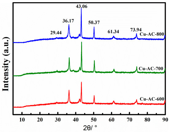 The samples activated at 600, 700, and 800 °C were labeled as Cu-AC-600, Cu-AC-700, and Cu-AC-800, respectively. Figure 1 presents the XRD patterns of the Cu-AC samples prepared at different activation temperatures. The sharp diffraction peaks located at 43.06 and 50.37 indicated the existence of Cu0 (JCPDS 04-0836) in the prepared samples. With the increase of activation temperature, the characteristic diffraction peak of Cu0 was enhanced. Further, weak diffraction peaks were observed at 2θ of 29.44°, 36.17°, and 61.34°, which were the characteristic peaks of Cu2O (JCPDS 05-0667) [27]. It is worth noting that there was no obvious diffraction peak of CuO.