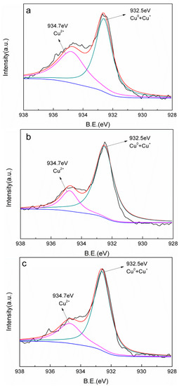 In order to analyze the surface valence state of copper, XPS analysis was performed as shown in Figure 3. It can be found that the Cu 2p spectra can be divided into two components. The main peak at 932.5 eV was assigned to Cu0 and Cu+, while the other weak peak located at 934.7 eV could be attributed to Cu2+ [28,29]. Remarkably, Cu0 and Cu+ species played dominant roles in all of the Cu-AC samples. Unfortunately, as the binding energy of Cu0 and Cu+ is relatively close, it is difficult to distinguish them. It is worth noting that with the increase of the annealing temperature, the proportion of Cu0 and Cu+ increased. The percentage of Cu0 and Cu+ for Cu-AC-800 can reach 73.1% (Table 2), indicating that a better reductive degree was obtained for Cu-AC-800.