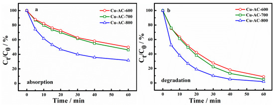 Considering that the activation temperature could affect not only the surface physical properties of catalysts, but also the morphology of the metal, the catalytic activity and adsorption ability of catalysts at different activation temperatures were explored, as shown in Figure 4. Figure 4a,b shows the adsorption and degradation of X-3B using different catalysts. It can be seen from Figure 4a that the X-3B adsorption ratios of Cu-AC-600, Cu-AC-700, and Cu-AC-800 were 50.2%, 53.9%, and 68.3%, respectively, at 60 min. It is indicated that increasing the activation temperature has conduced to the improvement of the adsorption performance of the catalysts. It also can be concluded that the degradation rate of X-3B has been significantly improved after adding PS. The removal ratio of Cu-AC-600, Cu-AC-700, and Cu-AC-800 reached 91.3%, 95.0%, and 98.1%, respectively, at 60 min (Figure 4b). This shows that the catalyst can achieve a higher oxidative degradation rate of X-3B by activating persulfate.