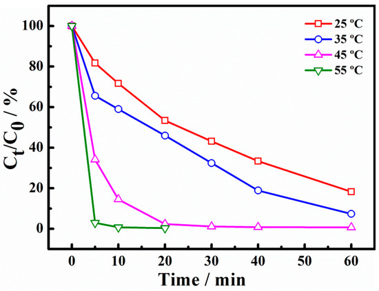 The removal rates of X-3B catalysts at different reaction temperatures are presented in Figure 7. It can be seen that after 30 min, the degradation rates of X-3B were 50.9%, 65.8%, 100%, and 100%, respectively, when the reaction temperature was 25, 35, 45, and 55 °C. The data showed that with the increase of reaction temperature, the degradation rate of X-3B was also increased, which may be attributed to the acceleration of the PS activation and the production of more •SO4−. Moreover, the reaction rate of the active radical with X-3B was also accelerated. When the temperature of the system was 5 °C, the degradation rate increased sharply, possibly owing to the thermal activation of PS [7,8]. Under the combined action of catalytic activation and thermal activation, the system accelerates the generation of active radicals, thus promoting the degradation rate of X-3B.