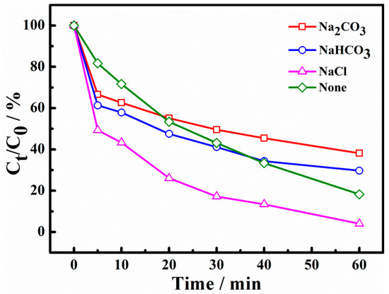 As is well known, a lot of inorganic salts are left in dyeing wastewater. In this experiment, sodium carbonate, sodium bicarbonate, and sodium chloride were selected to investigate the effect of different inorganic salt anions on dye degradation. As illustrated in Figure 8, it can be seen that the X-3B degradation ratio reached 77.05% at 60 min without inorganic salt anions. The degradation ratios became 58.10%, 65.59%, and 94.46% with the addition of CO32−, HCO3− and Cl−, respectively, indicating that CO32− and HCO3− had a certain inhibitory effect on the removal of X-3B, while Cl− showed a promoting effect. The reason for this is the powerful free radical scavenging effect of CO32− and HCO3−, which can react with •SO4− to produce low-activity free radicals (Equations (6) and (7)) [33,34]. The scavenging of radicals would reduce the oxidation capacity and affect the degradation of X-3B. Although Cl− can be transformed into •Cl and •Cl2− with weak oxidation ability (Equations (8) and (9)), it still has a strong reactivity with electron-rich groups such as X-3B [14,35]. Therefore, Cl− promoted the removal of X-3B.