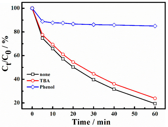 To identify the dominating species in X-3B degradation, the process was performed using different radical scavengers. Based on the literature, Tert-butanol (TBA) can be used as a scavenging agent for •OH (k•OH/TBA = 3.8 × 108 − 7.6 × 108 M−1s−1, k•SO4−/TBA = 4 × 105 − 9.1 × 105 M−1s−1) and phenol as a scavenging agent for both •SO4− and •OH (k•SO4−/phenol = 8.8 × 109 M−1s−1, k•OH/phenol = 6.6 × 109 M−1s−1) [4,12,36,37]. Experimental results of free radical capture are shown in Figure 10. As can be seen from the figure, when the molar ratio of TBA and reactants reached 1000/1, the degradation rate for 60 min was 74.4%. By contrast, the degradation rate was only 18.4% with the addition of phenol under the same molar ratio. It can be concluded that the inhibitory effect of TBA was not obvious. This means there was a small number of •OH in the system. The addition of phenol can inhibit the reaction sharply. The main active free radical in the system was •SO4−.