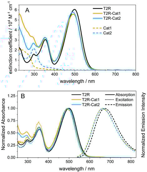 First insights into the light-induced processes in T2R, T2R-Cat1, and T2R-Cat2 are obtained from steady-state spectroscopy. In acetonitrile (ACN), the absorption spectra for all compounds show two main bands at 355 and around 495 nm (Figure 2). The band at 355 nm is assigned to the triphenylamine-centered transition, while the additional small band at 298 nm might be due to a localized transition on the bithiophene linker [25,26]. Below 320 nm, the dyads additionally show contribution from the respective cobalt catalysts. In the visible region, the strong band at 495 nm results from the HOMO-LUMO transition with intramolecular charge-transfer (ICT) character from the TPA donor to the cyanoacrylate acceptor. Compared to the two dyads, the ICT band of T2R is slightly red-shifted (∆E ≈ 200 cm−1), which might stem from the stronger electron-withdrawing character of the ester terminal group in comparison with the amide, slightly increasing the push-pull character of the dye. As previously reported [23], the presence of the rigid CPDT unit strongly enhances the light-harvesting efficiency in the visible region (ε of 60,300 M−1∙cm−1) compared to our previously-studied dyads relying on mono- or bis-thiophene units (ε of 31,800 and 38,600 M−1∙cm−1, respectively) [12,13,17,27].
