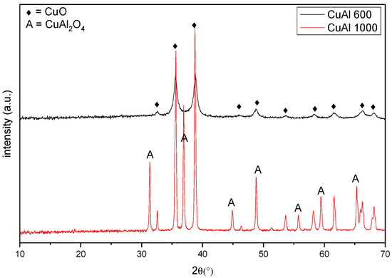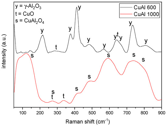 Figure 5 shows the Raman spectra of CuAl 600 and CuAl 1000. From the microscopy images, grey areas with black spots were visible. For this reason, the beam was focused on the light colored areas, where the typical signals of CuO are very low. For CuO, only three optical phonon modes (Ag + 2 Bg) out of nine (4Au + 5Bu + Ag + 2Bg) are Raman active. These are found at 288 cm−1 (Ag), 330 and 621 cm−1 (Bg), with a weak intensity in the presented spectra [33]. The remaining bands match very well with those predicted for γ-Al2O3 by Liu et al. [34]. In the mentioned study, the phonon frequencies were calculated for a spinel (as γ-Al2O3 is usually described as a defective spinel) and a non-spinel model, based on the dehydration of boehmite γ-Al2O3. There are 57 Raman active modes for the spinel model: 34 Ag and 23 Bg, while for the non-spinel mode there are 60 (34 Ag and 26 Bg). The peaks in the spectra at 210, 370, 410, 490, 560, 640 and 670 cm−1 match well with the most intense peaks observed in the theoretical study for the spinel model, while the relative intensity and Raman shift of the peaks at 740 and 810 cm−1 match rather with those of the non-spinel model.