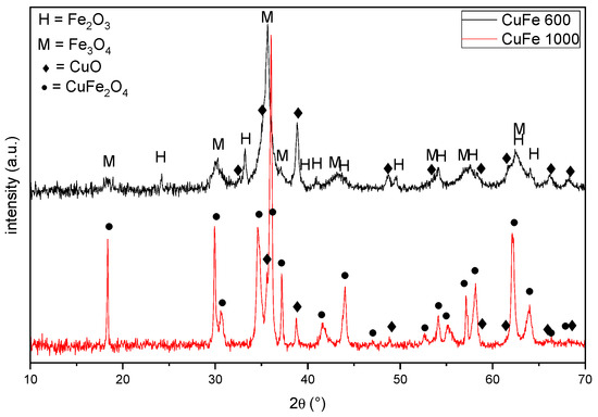 The XRD patterns of the CuFe samples are shown in Figure 2. Here, after the thermal treatment at 600 °C, a mixture of oxides is observed, with hematite (Fe2O3), magnetite (Fe3O4) and tenorite (CuO) phases present. On the other hand, at 1000 °C only the spinel structure of CuFe2O4 and tenorite (CuO) are observed. CuO phase shows an increase of the crystallites size from 17 nm to 46 nm when calcined at 600 °C and 1000 °C, respectively (Table 1).