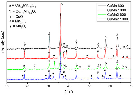 XRD of CuMn and CuMn2 calcined at 600 and 1000 °C.