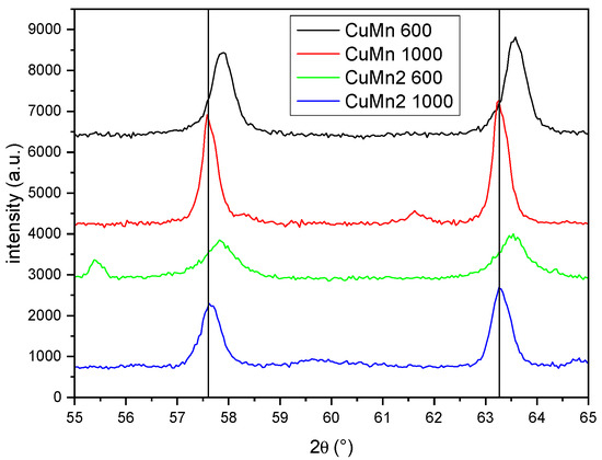 Figure 3 shows the diffractograms of different Cu-Mn samples (Cu:Mn = 1:1 = CuMn, Cu:Mn = 1:2 = CuMn2). In both cases, at 600 °C the crystal structure of Cu1,5Mn1,5O4 is present in the composites. This structure has been reported in previous studies in literature [10,14,19,30,31]. After the calcination at 1000 °C, the structure is slightly changed in both ratios of the Cu:Mn systems. A clear evidence of this modification is observed for the reflections at 57.6° and 63.3°, which represent the (115) and (044) plane, respectively (Figure 4). For CuMn 1000, an extra tenorite (CuO) phase, with a size of 26 nm, is detected in the XRD. In the case of CuMn2, where more Mn is present than necessary to form Cu1.5Mn1.5O4, a segregated bixbyite phase (Mn2O3) is obtained from the additional Mn. At 1000 °C, the Mn phase formed is hausmannite, which is written as Mn2+Mn23+O42−, and its crystal structure arrangement is similar to a tetragonally deformed spinel [32].