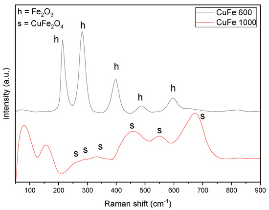 In the spectra of CuFe 1000 (Figure 6), most of the bands are attributed to the cubic copper ferrite structure, while other do not match this structure. Chatterjee et al. report the appearance of some extra bands at 388 cm−1 together with a weak band at 625 cm−1, which is likely also the case here. In their study, the reason for the extra bands is related to the exciting radiation of the Raman laser (532 nm), being larger than the particle diameter [40].