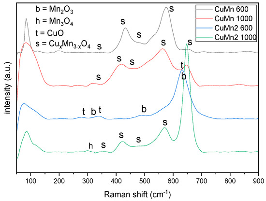 Finally, in Figure 7 the Raman spectra of the manganese containing compounds are presented. Similar to the previous spinel compound, five Raman active modes (A1g + Eg + 3F2g) are expected to appear. The band at 650 cm−1 can again be assigned to A1g and at 430 cm−1 to Eg. Around 350, 470 and 580 cm−1 the F2g modes are found [41]. The Raman active optical modes of Mn2O3 (bixbyite) are found at 309, 500 and 640 cm−1 which is close to those of CuO (280, 330 and 621 cm−1) [42]. For this reason, only the mode at 500 cm−1 is definite evidence for the presence of Mn2O3. The Raman active modes of Mn3O4 (hausmannite) (310, 365, 472, 650 cm−1) are in this case also difficult to distinguish from those of the copper manganite spinel structure as this material also has the spinel structure and most of the bands overlap.