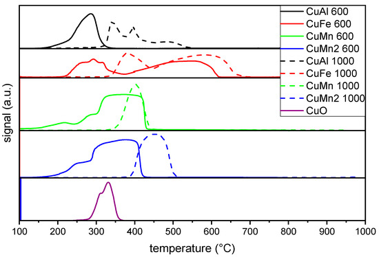 H2-TPR provides information about the reducibility of the catalysts and the technique is used to compare the different samples. The reduction profiles are represented as a function of temperature (Figure 8). The profile of bulk CuO is added as a reference material. For CuO, the onset of reduction appears around 275 °C with the maximum being at 330 °C. The peaks for the as-prepared materials are in all the cases very broad, which makes it difficult to conclude any statements on speciation. One noticeable observation about these results is that all the materials calcined at 600 °C have their onset temperatures at significantly lower temperatures than bulk CuO, which means that the CuO particles are very small and in a dispersed state in the samples or have become more reducible, due to interactions with the other metal oxide [6,13,43,44,45]. The lowest onset temperature can be found for CuMn 600 although all the synthesized materials show a peak under 250 °C, probably due to highly dispersed CuO present on the other oxide but not bound to it. Both CuMn 600 and CuMn2 600 already show reduction above 350 °C due to Cu2+ in the spinel phase. After the calcination at 1000 °C, the difference between the materials becomes larger with the onset temperature being under 350 °C for CuFe 1000 and CuAl 1000 while it’s closer to 400 °C for CuMn2 1000. In this case, the difference is probably due to the fact that CuO is reduced easier than Cu in the spinel structure. In all the cases, there is a more than 100 °C shift between the calcination at 600 °C and 1000 °C, proving that Cu2+ in the spinel structure is less reducible when the crystallinity is increased for this mixed oxide structure.