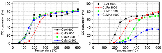 CO conversion of the materials calcined at 600 °C (left) and 1000 °C (right).