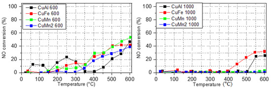 NO conversion of the materials calcined at 600 °C (left) and 1000 °C (right).