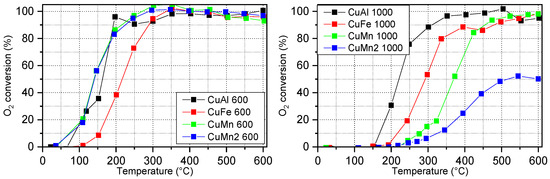 O2 conversion of the materials calcined at 600 °C (left) and 1000 °C (right).