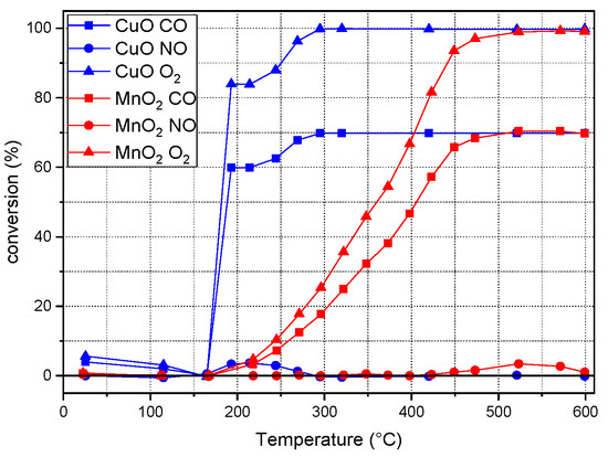 The mixture of copper and manganese oxides is quite known for the oxidation of CO under the name “hopcalite”. Originally, this was developed during the first World War to remove CO from air in gasmasks [5,8,9]. One of the most active forms of the mixture consists of 60% MnO2 and 40% CuO [5,9]. Most literature that feature hopcalite-like mixtures focus on oxidation reactions only such as CO [6,10,11,12,13] or VOCs [14,15,16] and not on the simultaneous removal of NO as in the case of three-way catalysis.