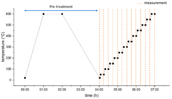The catalytic performance was tested in a fixed bed continuous flow quartz reactor, with a total gas flow rate of 200 mL/min. The tested powders were pelletized using an IR pelletizer, crushed and sieved in order to obtain a particle size between 150 and 300 µm. 200 mg of the sieved powder was loaded in the reactor and pre-treated under the same gas flow as during the test. The speed ramping from room temperature to 600 °C was 10 °C/min, maintaining this temperature for 1 h and then cooling back to room temperature. The catalytic test was done by ramping with 10 °C/min from room temperature to 600 °C and holding the temperature about every 50 °C for at least 10 min, in order to have a constant conversion value of the measurement. Figure 14 illustrates the protocol in a relevant timescale. The levels of CO and NO, from which the conversions were calculated, were measured using a Dräger polytron 7000 CO-detector and a 7Solutions GDS-15JP1-CA-NO NO-detector, respectively. The experimental set-up is illustrated in Figure 15. The conversion of O2 was calculated from the conversion of CO, assuming that all NO conversion was due to the reaction between CO and NO to form N2 (Reaction 2). The following formula was used for the O2 conversion: