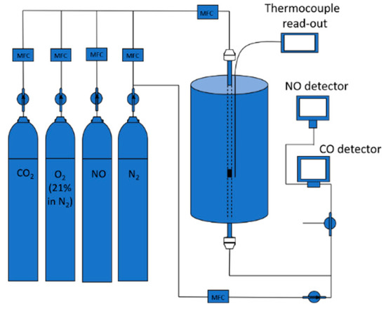 The concentrations of the gases in the mixtures were as follows: CO: 3000 ppm, NO: 1000 ppm, O2: 1050 ppm with N2 being the balance gas.