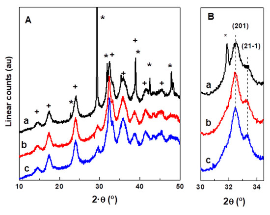 Figure 1. X-ray diffraction (XRD) patterns (A) and expansion in the interval 30–35° (B) of the hydroxycarbonate precursors: (a) W/O (), (b) W1 (), (c) W3 () (+ zinzian-malachite ((Cu/Zn)2CO3(OH)2, * NaNO3).