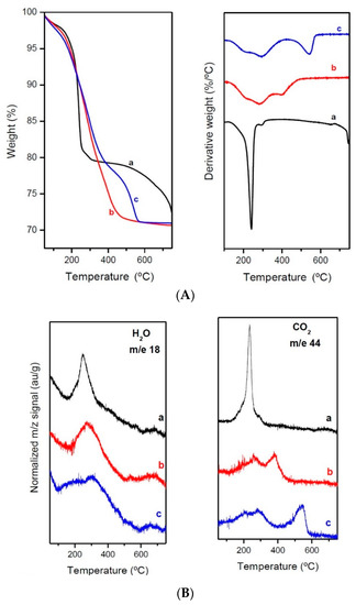Figure 3. Thermogravimetry/differential thermal analysis (TG/DTA) patterns (A) and mass spectrometry (MS) traces (H2O and CO2) (B) corresponding to the decomposition of the hydroxycarbonate precursors: (a) W/O (), (b) W1 (), (c) W3 ().