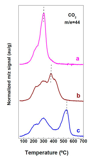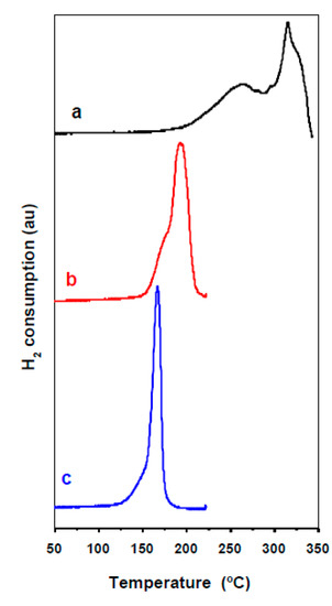 Reducibility of the calcined catalysts was studied by hydrogen temperature programmed reduction (H2-TPR). TPR experiments were carried out in semi-automatic equipment (PID Eng and Tech, Micromeritics, Norcross, GA, USA) with a thermal conductivity detector (TCD). 30 mg of calcined sample was placed into a U-shaped quartz reactor (4.0 mm ID) and heated from 25 up to 300 °C with a heating rate of 10 °C·min−1 under H2/Ar flow (10 vol.%, 50 mL·min−1).
